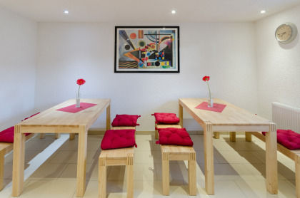 An einer Auenwiese gelegen, ist die Pension an der Wetschaft neben dem gleichnamigen Fluss (Wetschaft) mit einer sehr guten Verkehrsanbindung in Richtung Marburg wie auch einen sehr schönen Radweg entlang der Lahn. Die Pension bietet 8 behagliche Zimmer alle mit Bad und TV. Eine große vollausgestattete Gemeinschaftsküche und gute Parkmöglichkeiten stehen den Gästen zur Verfügung.